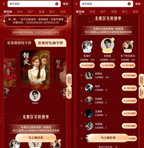 星芒短剧春节不停播,品质剧集陪你过大年。为增加传统佳节的喜庆感,快手星芒短剧春节档基于多元题材剧集和六大剧场矩阵,打造「星芒冠冕演员」冠冕争霸赛等趣味玩法。活动期间,用户完成互动任务即可获得投票打榜和抽奖机会,不仅能够助力心仪演员登上冠冕王座,还有望解锁获奖演员签名照、至高价值8999元新春大奖等福利。