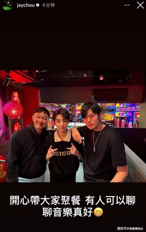 更让粉丝惊喜的是,周杰伦随后晒出另一张合照,除了他与Eason外,还出现了内地人气男星王俊凯。周杰伦写道:“开心带大家聚餐,有人可以聊聊音乐真好!”