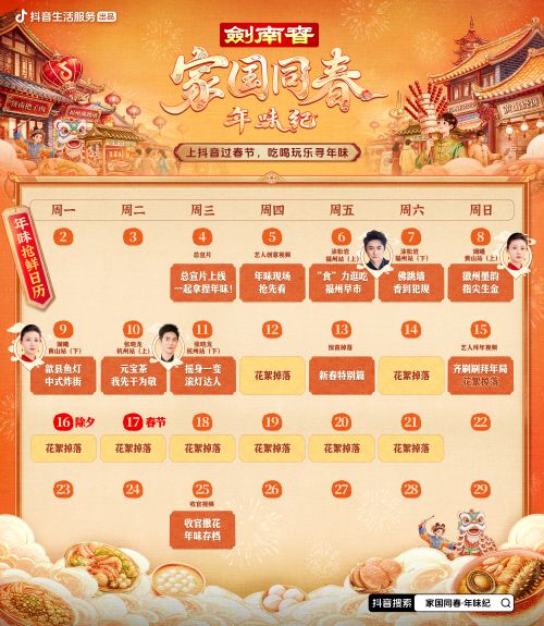 更多“地域限定”的欢喜过大年场景,上抖音搜索“家国同春年味纪”就能解锁!节目先导片已上线,2月6日起,节目正片将每天更新,还有惊喜特辑和花絮,带大家走入不同城市的年俗画卷,感受团圆的温暖和节日的喜悦。别忘了锁定年味抢“鲜”日历,每日追更不迷路,年味精彩看不停!