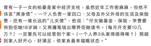 在一次采访中,周柏豪自曝,他每个月要负责三个家庭的开销。除了自己与妻子、孩子组成的家庭外,父母和岳父岳母的生活费也全都由他来承担。为了让家人能够安享生活,他不但为每位家人购买了各种保险,而且这些保险的费用全都由他来支付。再加上孩子的教育基金、学杂费等,每月的固定开销已经突破六位数,达到十多万。周柏豪坦言,这些开销是基本的固定支出,没有十几万的收入,根本无法支撑三个家庭的日常开销,压力可想而知。然而,尽管压力山大,他表示,能够照顾到家人,是他最满足的事情,现在的状态,已经是他最幸福的时刻。