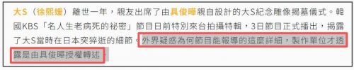 具俊晔在节目里把大S去世的细节曝光个底儿掉,本来观众都好奇,怎么节目组会把大S就医时间线了解得那么详细,甚至直言是大S自己想回家治疗,经过节目组证实,原来都是具俊晔授权的。