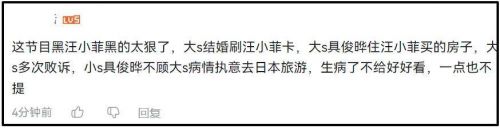 除此之外,节目里还重点提到了汪小菲和大S之间的纠纷,对汪小菲全是吐槽,现场嘉宾直接骂他是“窝囊废的终结者”,具俊晔则被赞为“情种”。