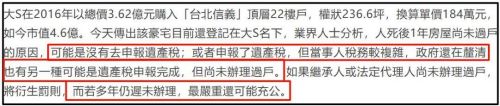 此前台媒爆料,具俊晔会放弃遗产继承,都给两个孩子,部分网友得知之后还很感动。没想到台媒又爆料称大S的豪宅至今仍在她名下,疑似是因为遗产税的问题,迟迟没有办理过户,如果多年都不办理的话,最严重的情况,甚至可能充公。