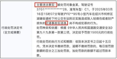金晨肇事逃逸的处罚曝光,狗仔晒出金晨的处罚结果,造成致人轻微伤或者财产损失的交通事故后逃逸,罚款1500元,彻底成了违法艺人!处罚决定书中表明,金晨主要违法事实为,驾驶小型汽车