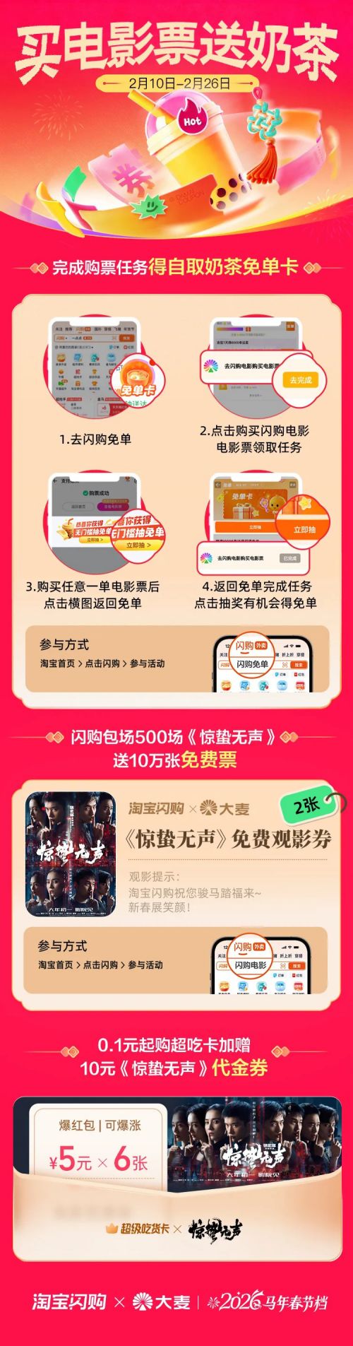 大麦联动淘宝闪购于春节档重磅推出「跟着电影品美食」主题活动计划,2月10日正式上线!活动以双重福利解锁新春观影新体验: