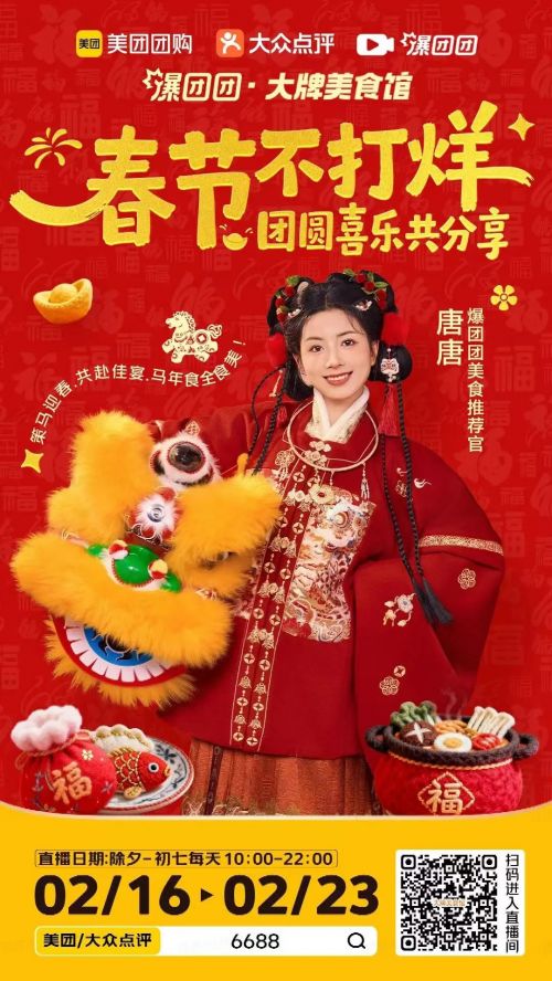 2月6日,用户在美团app搜索“跟着电影品美食”或直接扫码进入直播间,观看美团与春节档热门电影《熊出没·年年有熊》发起电影主题 X 美食直播:百万美食补贴覆盖绍兴、杭州、南京等多个城市,上百个商户、超过500个套餐,美食优惠1折起购!