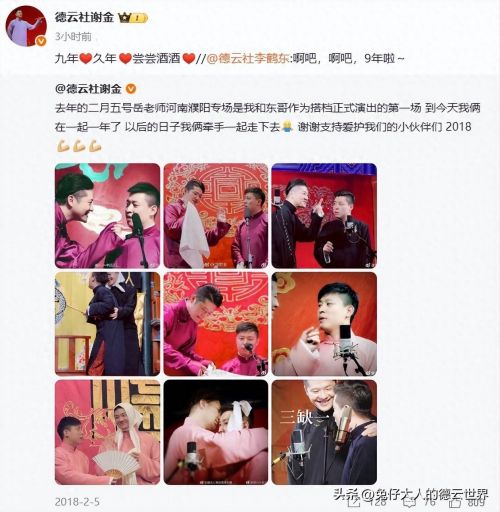 2月5日,德云社的谢金与李鹤东相继发文,在他们搭档九周年之际,彼此间的深情告白,竟然让这两个老爷们也显得如此煽情与浪漫。看着这一幕,不禁让粉丝们感动,网友们也纷纷加入了这场