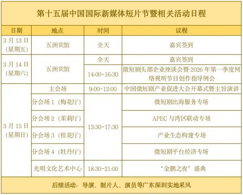 第十五届中国国际新媒体短片节以“光影潮涌,剧向蓝海”为主题,包含“一项盛典、一场大会,多维对话”多项内容,计划举办“金鹏之夜”盛典、中国微短剧产业促进大会以及微短剧出海服务专场、APEC与湾区联动专场、产业生态构建专场、微短剧平台经济专场等分会场活动,同期,深圳还将举办国际微短剧市场,打造首个专注于微短剧产业的交易展示平台,汇聚全球创作力量、头部平台、出海机构与产业资本,聚焦内容创新、技术应用、商业变现与国际合作,为青年创作者提供扶持机遇,为行业发展注入新动能。