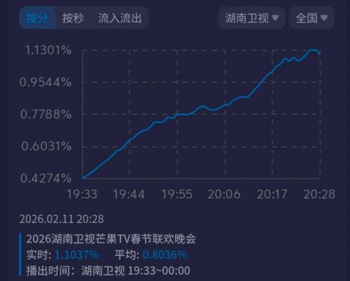 再看2026年湖南卫视小年夜春晚收视,等了小一个小时才勉强破1%,上涨过程还起起伏伏,网友的吐槽声就没停过。