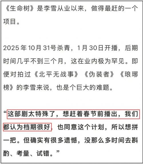 李雪还在采访中说了许多作品“背后的故事”,比如该剧十分“特殊”,杀青之后定下来在春节档播出。为了能够在预定的、很好的春节档播出,该剧后期时间几乎不到三个月,赶进度已经是难题,自然也就没有时间去斟酌、考量和试错。