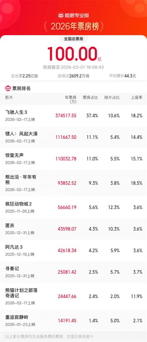 2026年中国电影票房突破100亿!