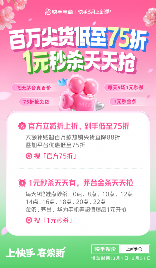 3月1日,以“上快手 春焕新”为主题的快手3月上新季宣布正式开售,不仅有百万尖货破价直降88折、官方立减到手低至75折,还有大牌好货1元秒杀,每天9轮天天开抢。
