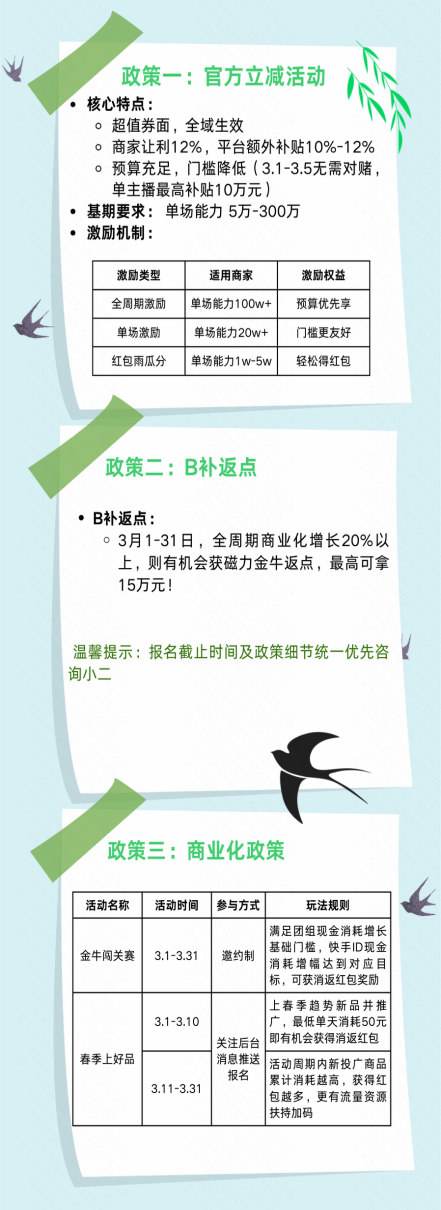 在此基础上,快手电商为商家提供了多重激励,推出官方立减活动,商家达到让利门槛即可获得平台10%-12%的额外补贴。针对不同商家,还设有全周期激励、单场激励及红包雨瓜分的多重激励机制,单主播最高补贴可达10万元。期间,全周期商业化增长20%以上商家,则有机会获得最高15万元的磁力金牛返点补贴,此外还设置了金牛闯关赛、春季上好品两类政策机制,完成目标的商家即有机会获得红包奖励及海量流量资源。