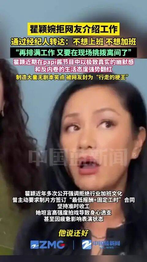 瞿颖自述拍戏曾因超时、如厕难而“挑拨离间”问同事“你不累吗?”,后调整策略要求合同明确工时,拒绝模糊加班。