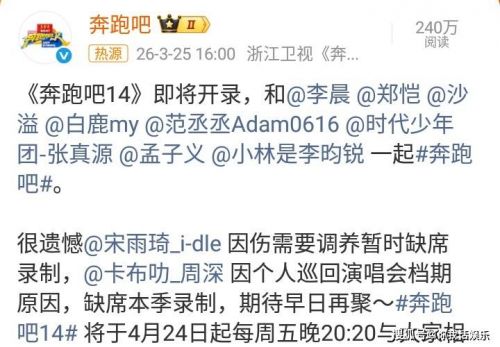 《奔跑吧14》,便是往期《奔跑吧》综艺节目的新一季延续!意义很大。最后来看,奔跑吧提到两位明星艺人。第一位是宋雨琦,另一位是周深。原来,《奔跑吧14》录制过程中,有明星艺人缺席录制。奔跑吧发文,提到了他们缺席录制的原因,清楚明白,让人看上去一目了然!