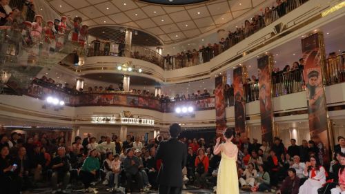 另一边,邮轮中庭的电影金曲联唱同样热火朝天。《英雄赞歌》《闪闪的红星》《花儿为什么这样红》《让我们荡起双桨》……从青春岁月的纯真到奋斗年代的激昂和家国情怀的厚重,当熟悉的旋律奏响,船舱瞬间变成大型合唱现场。