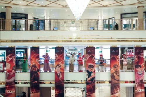走进爱达·魔都号,迎面而来的就是经过精心布置的“光影珍藏”展区,胶片元素串联起一幅幅长影经典电影海报,仿佛时光隧道,诉说着银幕背后不为人知的故事。