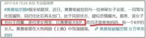 黄景瑜和张艺上在2017年因为合作《为了你我愿意热爱整个世界》认识,由于两人片场互动过于暧昧传出绯闻,比如黄景瑜让张艺上玩她的手,远超出了一般朋友关系。而后,狗仔卓伟爆料黄景瑜已婚,还拍到了他与单亲妈妈王雨馨同框约会的画面,而他与张艺上的绯闻在当时并未掀起波澜。