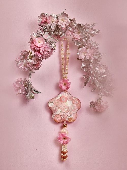 樱花清酒提花香囊 锦面粉白相间,天然白色珍珠贝手工逐颗串制,透亮轻盈,自然光下色泽柔和内敛。缀有一只可爱小兔,随身携带,所经之处,皆是樱花香气。
