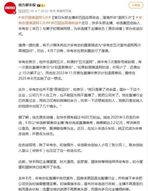 那真正的退居幕后是什么时候?辛巴给出了明确时间线:2023年11月他在直播中透露计划,最终在2025年8月才真正实施,把公司交给了妻子初瑞雪管理。所以在他看来,这次露面根本谈不上什么“高调回归”。
