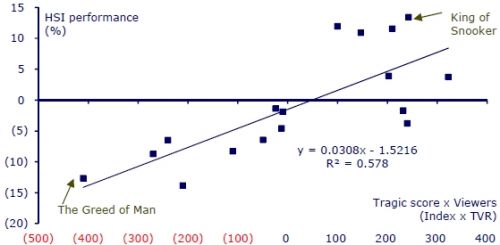 这个离奇现象引发了经纪投资公司CLSA亚太市场有限公司开展的多项正式金融研究。2004年,GabrielChan与KennyLau针对每档郑少秋电视节目播出期间恒生指数特定百分比跌幅,对三个月市场上涨潜力进行了回归分析。2012年,Man Ho Lam & Francis Cheung 对研究进行了二次评估。通过回归分析法计算得出悲剧评分与电视收视率乘积对HSI(收视满意度指数)百分比变化的影响。