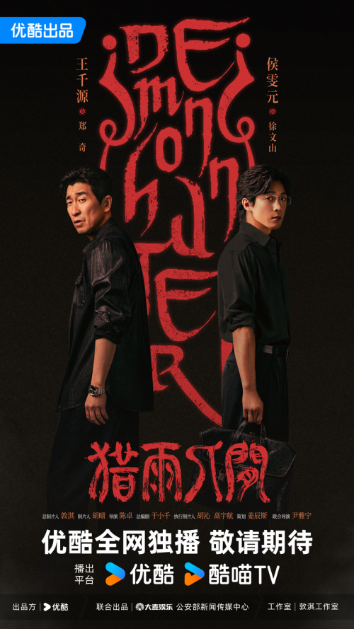 随着首轮物料释出,王千源饰演的郑奇与侯雯元饰演的徐文山的关系也逐渐揭晓,双人视频中,郑奇神情凌厉,眉宇间藏着深不可测的执念,于弥漫烟雾中照出一抹亮,似乎预示着在这个迷雾重重的悬案中郑奇会撕开所有黑暗与谎言;而徐文山在画室看似温柔含笑,实则却满脸血迹眼中都是算计,斯文儒雅的外形下藏着狠戾底色,二人似乎各有立场;双人海报中,二人背向而立,身后是诡秘的血色印记,红黑肃杀的底色里藏着势均力敌的张力。一个是步步为营的追猎者,一个是假面藏锋的隐匿者,二人亦敌亦友、明暗对弈,一场横跨十一年的雨幕“狩猎”即将拉开序幕。